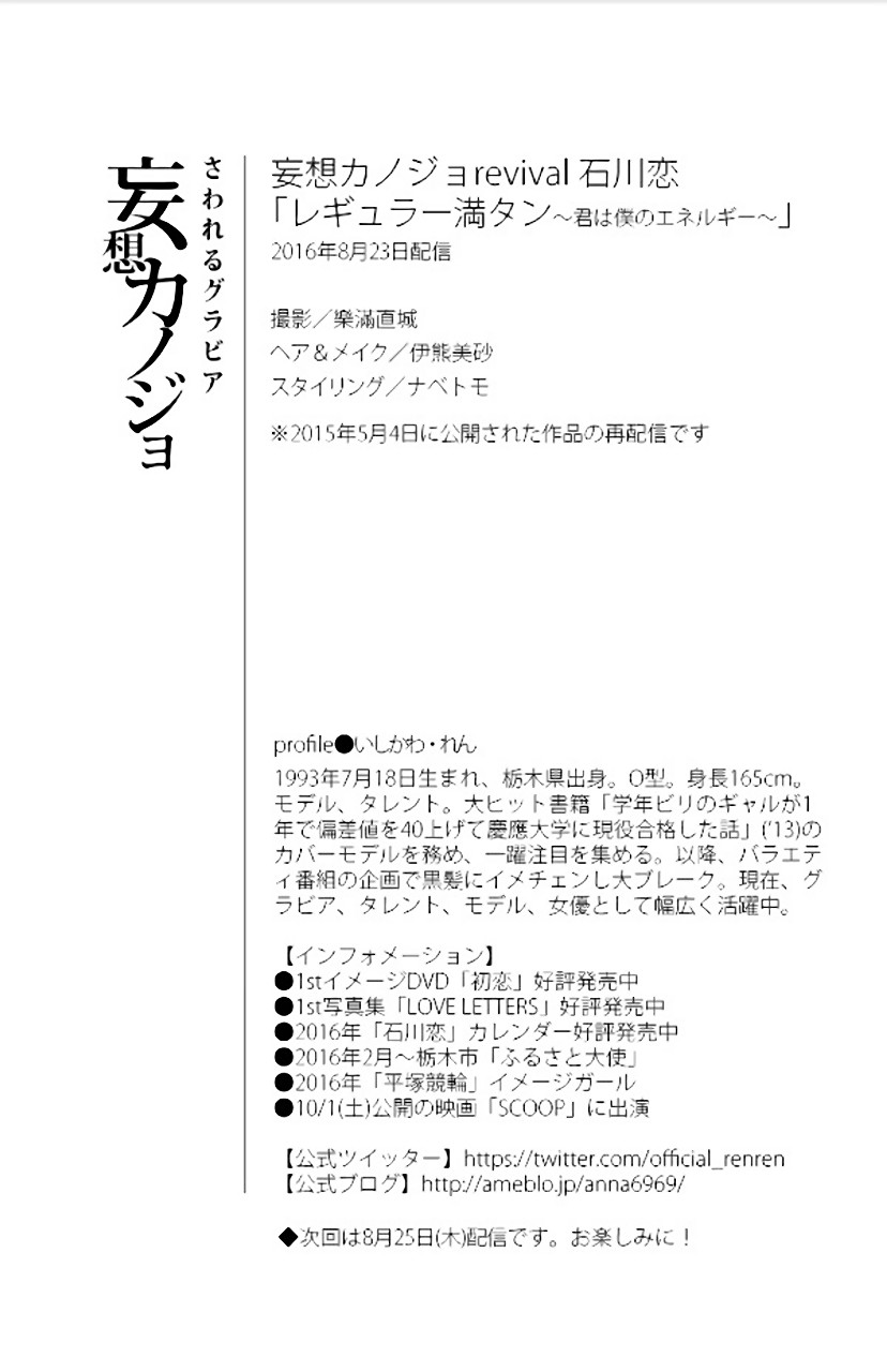 ≪プロフィール≫ 本名/石川 恋 【いしかわ れん】 出身/栃木県栃木市 生年月日/1993年(平成5年) 7月18日(日) 星座/かに座 血液型/O型 身長 体重/165cm -kg スリーサイズ/B83 W56 H83 趣味/映画鑑賞、漫画を読む 特技/体が柔らかく開脚やY字バランスができる ------------------------------------- 所属/テンカラット 職種/モデル、女優 ブログ/石川恋オフィシャルブログ (Ameba) Twitter/@official_renren Instagram/ren_ishikawa ------------------------------------- ◆ 映 画 ◆ ぐらんぶる 〔吉原愛菜 役〕 配給<ワーナー・ブラザース映画> ≪新型コロナの影響にて公開延期≫ ◆ テレビ ◆ 映画 運命から始まる恋 ~You are my Destiny~ 〔白石杏奈 役〕 <フジテレビ系> ≪毎週金曜 24:55~25:30≫ ◆ Blu-ray ◆ ドラマ 福岡恋愛白書15 消えない恋の花火 〔主演:小嶋香奈 役〕 ≪5月20日(水) Release≫ 販売<オデッサ・エンタテインメント> [一部Wikipedia(ウィキペディア)参考] <新型コロナウイルス感染症(COVID-19)>