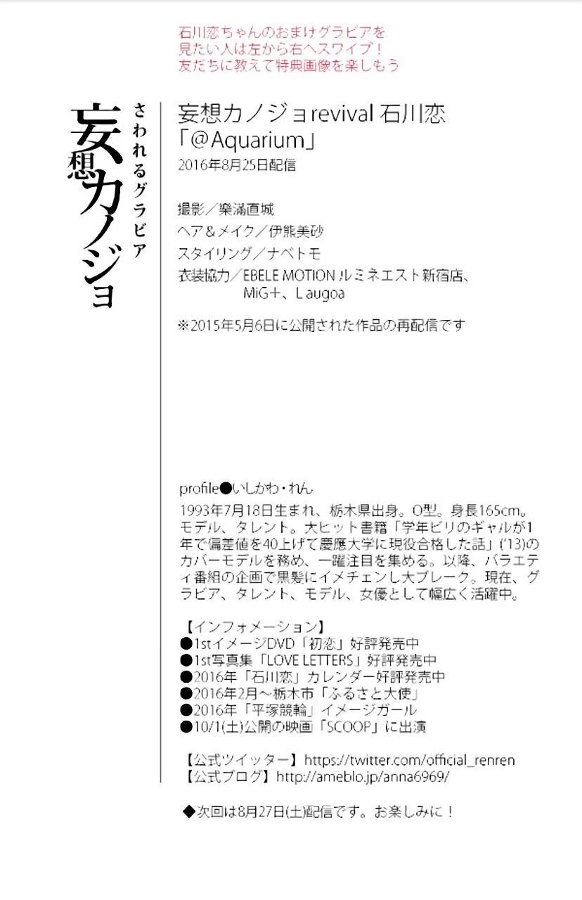 ≪プロフィール≫ 本名/石川 恋 【いしかわ れん】 出身/栃木県栃木市 生年月日/1993年(平成5年) 7月18日(日) 星座/かに座 血液型/O型 身長 体重/165cm -kg スリーサイズ/B83 W56 H83 趣味/映画鑑賞、漫画を読む 特技/体が柔らかく開脚やY字バランスができる ------------------------------------- 所属/テンカラット 職種/モデル、女優 ブログ/石川恋オフィシャルブログ (Ameba) Twitter/@official_renren Instagram/ren_ishikawa ------------------------------------- ◆ 映 画 ◆ ぐらんぶる 〔吉原愛菜 役〕 配給<ワーナー・ブラザース映画> ≪新型コロナの影響にて公開延期≫ ◆ テレビ ◆ 映画 運命から始まる恋 ~You are my Destiny~ 〔白石杏奈 役〕 <フジテレビ系> ≪毎週金曜 24:55~25:30≫ ◆ Blu-ray ◆ ドラマ 福岡恋愛白書15 消えない恋の花火 〔主演:小嶋香奈 役〕 ≪5月20日(水) Release≫ 販売<オデッサ・エンタテインメント> [一部Wikipedia(ウィキペディア)参考] <新型コロナウイルス感染症(COVID-19)>