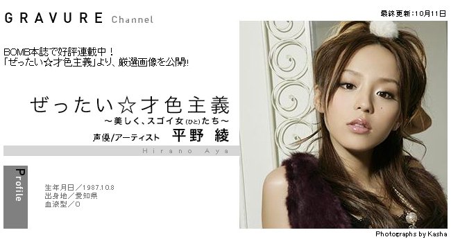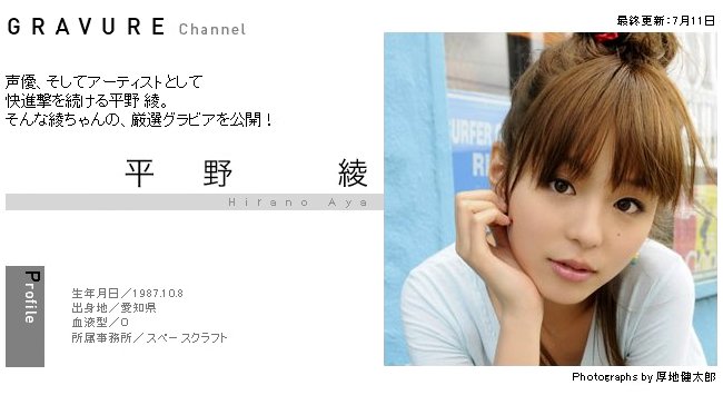 [一部Wikipedia(ウィキペディア)参考] 平野綾 095 平野綾 100 平野綾 105 平野綾 096 平野綾 101 平野綾 106 平野綾 097 平野綾 102 平野綾 107 平野綾 098 平野綾 103 平野綾 108 平野綾 099 平野綾 104 平野綾 109 平野綾 110 平野綾 115 平野綾 120 平野綾 111 平野綾 116 平野綾 121 平野綾 112 平野綾 117 平野綾 122 平野綾 113 平野綾 118 平野綾 123 平野綾 114 平野綾 119 平野綾 124 平野綾 125 ≪プロフィール≫ 本名/平野 綾 【ひらの あや】 出身/愛知県名古屋市 生年月日/1987年(昭和62年) 10月8日(木) 星座/てんびん座 血液型/O型 身長 体重/159cm -kg スリーサイズ/B83 W53 H84 趣味/読書 特技/ピアノ ------------------------------------- 所属/Grick 【グリック】 ジャンル/声優、歌手、タレント HP/Aya Hirano Official Website ブログ/AsH (Ameba) Twitter/Hysteric_Barbie ------------------------------------- ◆ 舞 台 ◆ ウサニ (ダブルキャスト出演) 日程 : 8月3日(金)~26日(日) 18ステージ出演(スケジュール) 会場 : ル テアトル銀座 ◆ テレビ ◆ ドラマ ミューズの鏡 〔彩吹うらら 役〕 <日本テレビ(ローカル)> ≪毎週土曜 25:55~26:10≫ ドキュメント ティーンズプロジェクト フレ☆フレ 〔ナレーション〕 ≪4月6日より 毎週金曜 18:55~19:25≫ <Eテレ> ◆ ラジオ ◆ LISTEN?~Live 4 Life~ 〔月曜パーソナリティ〕 <文化放送> ≪毎週月曜 25:00~27:00≫