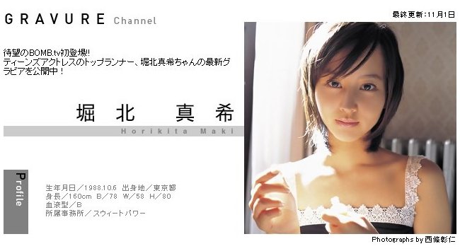≪プロフィール≫ 本名/原 麻里奈 【はら まりな】 出身/東京都清瀬市 生年月日/1988年(昭和63年) 10月6日(木) 星座/てんびん座 血液型/B型 身長 体重/160cm -kg スリーサイズ/B78 W58 H83 趣味/読書 特技/ピアノ ------------------------------------- 所属/Sweet Power 【スウィートパワー】 ジャンル/女優 HP/ほりきたコレクション モバイル/スウィートパワー♥モバイル 堀北真希 ------------------------------------- ◆ テレビ ◆ ドラマ 連続テレビ小説 「梅ちゃん先生」 〔主演:下村梅子 役〕 ≪4月2日より 毎週月~金曜 08:00~08:15≫ <NHK総合> トーク・広報 土曜スタジオパーク 〔ゲスト〕 <NHK総合> ≪4月7日(土) 14:00~15:00(生放送)≫