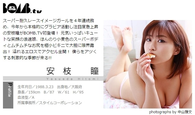 ≪プロフィール≫ 本名/安枝 瞳 【やすえだ ひとみ】 出身/大阪府貝塚市 生年月日/1988年(昭和63年) 3月23日(水) 星座/おひつじ座 血液型/A型 身長 体重/159cm -kg スリーサイズ/B87 W61 H95 趣味/ドライブ、買い物、スポーツ観戦 ------------------------------------- 所属/スタイルコーポレーション ジャンル/グラビア、タレント、歌手 HP/安枝瞳 公式ホームページ 音楽HP/HITOMI PLUGGED ブログ/やっさんブログ (Ameba) ------------------------------------- ◆ ラジオ ◆ 安枝瞳のヒトミシリ★Headrock <VOICE CUE> ≪毎週土曜 22:00~23:00≫ ◆ DVD ◆ イメージビデオ 僕色ハニー2 販売<ギルド> ≪12月22日(木) Release≫ ◆ Blu-ray & DVD ◆ 舞台 「青の祓魔師」京都紅蓮篇 〔霧隠シュラ 役〕 販売<ANIPLEX> ≪2017年1月25日(水) Release≫ [一部Wikipedia(ウィキペディア)参考] |