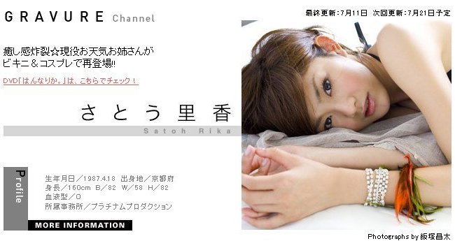 本日は矢口真里さん27歳の誕生日。 おめでとうございます♪ つい先日、昨年秋に破局していたという報道がありました。 次こそはいい人にめぐり逢える事を陰ながら応援してます。 ただ、酒はもう少し控えられたほうがよろしいかと。 健康面にしろ恋愛面にしろ、いろんな意味で…。 矢口真里 201 矢口真里 206 矢口真里 211 矢口真里 216 矢口真里 202 矢口真里 207 矢口真里 212 矢口真里 217 矢口真里 203 矢口真里 208 矢口真里 213 矢口真里 218 矢口真里 204 矢口真里 209 矢口真里 214 矢口真里 219 矢口真里 205 矢口真里 210 矢口真里 215 矢口真里 220 ≪プロフィール≫ 本名/矢口 真里 【やぐち まり】 出身/神奈川県横浜市 生年月日/1983年(昭和58年) 1月20日(木) 星座/みずがめ座 血液型/A型 身長 体重/144.5cm 39kg スリーサイズ/B75 W60 H80 趣味/マンガ収集、映画鑑賞、ゲーム 特技/ボストンバッグ・スーツケースに納まれる、口をハート型に出来る ------------------------------------- 所属/アップフロントエージェンシー ジャンル/タレント、歌手、女優 ブログ/初心者です。 ファンクラブ/M-line club モバイル/ポケットモーニング娘。 ------------------------------------- ◆ テレビ ◆ バラエティ How to モンキーベイビー! <TOKYO MX> ≪毎週水曜 23:30~24:00≫ 音楽情報 ヨーガク・スタイル <MUSIC ON! TV> ≪毎週水曜 24:45~25:00≫ バラエティ 世界を変える100人の日本人! <テレビ東京系> ≪毎週金曜 20:00~20:54≫ ◆ C D ◆ シングル(DVD付) 風をさがして 〔矢口真里とストローハット〕 ≪1月13日(水) リリース≫ ◆ WEB ◆ 無料動画番組 Talking Japan No.107 <OCN> [一部Wikipedia(ウィキペディア)参考] 磯山さやか 331 磯山さやか 341 磯山さやか 351 磯山さやか 361 磯山さやか 332 磯山さやか 342 磯山さやか 352 磯山さやか 362 磯山さやか 333 磯山さやか 343 磯山さやか 353 磯山さやか 363 磯山さやか 334 磯山さやか 344 磯山さやか 354 磯山さやか 364 磯山さやか 335 磯山さやか 345 磯山さやか 355 磯山さやか 365 磯山さやか 336 磯山さやか 346 磯山さやか 356 磯山さやか 366 磯山さやか 337 磯山さやか 347 磯山さやか 357 磯山さやか 367 磯山さやか 338 磯山さやか 348 磯山さやか 358 磯山さやか 368 磯山さやか 339 磯山さやか 349 磯山さやか 359 磯山さやか 369 磯山さやか 340 磯山さやか 350 磯山さやか 360 磯山さやか 370 ≪プロフィール≫ 本名/磯山 さやか 【いそやま さやか】 出身/茨城県鉾田市 生年月日/1983年(昭和58年) 10月23日(日) 星座/てんびん座 血液型/A型 身長/155cm スリーサイズ/B88 W60 H85 趣味/スポーツ観戦(野球)、アイドル研究、ドライブ、ゴルフ 特技/野球スコアブック付け ------------------------------------- 所属/ホリエージェンシー ジャンル/グラビア、タレント、女優 HP/磯山さやかの「スポーツフリーク」 ブログ/さやかの日記 (ココログ) /その部分っていりますか? 部分やせ-30cmへの道 (Ameba) モバイル/磯山さやかの「スポーツフリーク」 ------------------------------------- ◆ テレビ ◆ 情報 磯山さやかの『流行発信☆磯山ランド』 <BS日テレ> ≪毎週土曜 17:00~17:30≫ ◆ WEB ◆ 競艇コラム 磯山さやかのスポーツ魂 <スポーツ報知> ≪毎月第2、第4月曜 更新≫ [一部Wikipedia(ウィキペディア)参考] 綾瀬はるか 251 綾瀬はるか 261 綾瀬はるか 271 綾瀬はるか 252 綾瀬はるか 262 綾瀬はるか 272 綾瀬はるか 253 綾瀬はるか 263 綾瀬はるか 273 綾瀬はるか 254 綾瀬はるか 264 綾瀬はるか 274 綾瀬はるか 255 綾瀬はるか 265 綾瀬はるか 275 綾瀬はるか 256 綾瀬はるか 266 綾瀬はるか 276 綾瀬はるか 257 綾瀬はるか 267 綾瀬はるか 277 綾瀬はるか 258 綾瀬はるか 268 綾瀬はるか 259 綾瀬はるか 269 綾瀬はるか 260 綾瀬はるか 270 ≪プロフィール≫ 本名/蓼丸 綾 【たでまる あや】 出身/広島県広島市 生年月日/1985年(昭和60年) 3月24日(日) 星座/おひつじ座 血液型/B型 身長 体重/165cm 47kg スリーサイズ/B88 W61 H91 趣味/映画鑑賞 特技/バスケットボール 他スポーツ全般 ------------------------------------- 所属/ホリプロ ジャンル/女優、歌手 HP/綾瀬はるか 公式ホームページ モバイル/HORIPRO SQUARE 綾瀬はるか [一部Wikipedia(ウィキペディア)参考] さとう里香 161 さとう里香 171 さとう里香 181 さとう里香 162 さとう里香 172 さとう里香 182 さとう里香 163 さとう里香 173 さとう里香 183 さとう里香 164 さとう里香 174 さとう里香 184 さとう里香 165 さとう里香 175 さとう里香 185 さとう里香 166 さとう里香 176 さとう里香 186 さとう里香 167 さとう里香 177 さとう里香 187 さとう里香 168 さとう里香 178 さとう里香 188 さとう里香 169 さとう里香 179 さとう里香 189 さとう里香 170 さとう里香 180 さとう里香 190 ≪プロフィール≫ 本名/佐藤 里香 【さとう りか】 出身/京都府城陽市 生年月日/1987年(昭和62年) 4月18日(土) 星座/おひつじ座 血液型/O型 身長/160cm スリーサイズ/B82 W58 H82 趣味/映画鑑賞 特技/テニス、水泳、ピアノ ------------------------------------- 所属/プラチナムプロダクション ジャンル/グラビア、タレント HP/さとう里香 OFFICIAL SITE ブログ/さとう里香ブログ (GREE) モバイル/さとう里香 OFFICIAL SITE ---------------------------------
