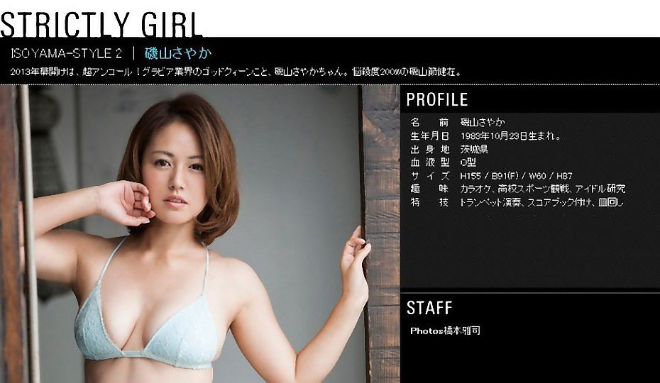 ≪プロフィール≫ 本名/磯山 さやか 【いそやま さやか】 出身/茨城県鉾田市 生年月日/1983年(昭和58年) 10月23日(日) 星座/てんびん座 血液型/A型 身長 体重/155cm -kg スリーサイズ/B88 W60 H85 趣味/スポーツ観戦(野球)、アイドル研究、ドライブ、ゴルフ 特技/野球スコアブック付け ------------------------------------- 所属/ホリエージェンシー 職種/グラビア、タレント、女優 ブログ/磯山さやか オフィシャルブログ (Ameba) Twitter/磯山さやか (sayaka23isoyama) ------------------------------------- ◆ テレビ ◆ 語学 テレビでハングル講座 <NHK Eテレ> ≪毎週月曜 22:00~22:25≫ 地域情報 磯山さやかの旬刊!いばらき <テレビ朝日(ローカル)> ≪毎週金曜 10:25頃~10:27頃≫ バラエティ 山中秀樹のあそびにマジメ <BSフジ> ≪毎月第3火曜 25:00~25:30≫ バラエティ 志村けんのだいじょうぶだぁ <フジテレビ系> ≪6月17日(火) 19:00~20:54≫ バラエティ 中居正広のミになる図書館 <テレビ朝日系> ≪6月17日(火) 23:25~24:25≫ ◆ ラジオ ◆ 磯山さやかのGoodナイト!Goodトーク! <ニッポン放送> ≪毎週月曜 19:00~19:20≫ 高田文夫のラジオビバリー昼ズ 〔金曜アシ〕 <ニッポン放送> ≪毎週金曜 11:30~13:00≫ [一部Wikipedia(ウィキペディア)参考] 岩佐真悠子 731 岩佐真悠子 741 岩佐真悠子 751 岩佐真悠子 761 岩佐真悠子 732 岩佐真悠子 742 岩佐真悠子 752 岩佐真悠子 762 岩佐真悠子 733 岩佐真悠子 743 岩佐真悠子 753 岩佐真悠子 763 岩佐真悠子 734 岩佐真悠子 744 岩佐真悠子 754 岩佐真悠子 764 岩佐真悠子 735 岩佐真悠子 745 岩佐真悠子 755 岩佐真悠子 765 岩佐真悠子 736 岩佐真悠子 746 岩佐真悠子 756 岩佐真悠子 766 岩佐真悠子 737 岩佐真悠子 747 岩佐真悠子 757 岩佐真悠子 767 岩佐真悠子 738 岩佐真悠子 748 岩佐真悠子 758 岩佐真悠子 768 岩佐真悠子 739 岩佐真悠子 749 岩佐真悠子 759 岩佐真悠子 769 岩佐真悠子 740 岩佐真悠子 750 岩佐真悠子 760 岩佐真悠子 770 ≪プロフィール≫ 本名/岩佐 真悠子 【いわさ まゆこ】 出身/東京都練馬区 生年月日/1987年(昭和62年) 2月24日(火) 星座/うお座 血液型/A型 身長 体重/155cm -kg スリーサイズ/B83 W58 H86 趣味・特技/ホルン(吹奏楽)、水泳 ------------------------------------- 所属/プラチナムプロダクション 職種/女優、タレント ブログ/岩佐真悠子オフィシャルブログ (Ameba) Twitter/岩佐 真悠子 (mayuko_iwasa) ------------------------------------- ◆ 映 画 ◆ 娚(おとこ)の一生 配給<ショウゲート> ≪2015年 全国公開≫ ◆ テレビ ◆ 映画 009ノ1 THE END OF THE BEGINNING 〔主演:ミレーヌ・ホフマン 役〕 <東映チャンネル> ≪7月11日(金) 25:00~26:30≫ ≪7月16日(水) 21:30~23:00≫ ≪7月28日(月) 04:00~05:30≫ [一部Wikipedia(ウィキペディア)参考] 吉瀬美智子 001 吉瀬美智子 011 吉瀬美智子 021 吉瀬美智子 031 吉瀬美智子 002 吉瀬美智子 012 吉瀬美智子 022 吉瀬美智子 032 吉瀬美智子 003 吉瀬美智子 013 吉瀬美智子 023 吉瀬美智子 033 吉瀬美智子 004 吉瀬美智子 014 吉瀬美智子 024 吉瀬美智子 034 吉瀬美智子 005 吉瀬美智子 015 吉瀬美智子 025 吉瀬美智子 035 吉瀬美智子 006 吉瀬美智子 016 吉瀬美智子 026 吉瀬美智子 007 吉瀬美智子 017 吉瀬美智子 027 吉瀬美智子 008 吉瀬美智子 018 吉瀬美智子 028 吉瀬美智子 009 吉瀬美智子 019 吉瀬美智子 029 吉瀬美智子 010 吉瀬美智子 020 吉瀬美智子 030 ≪プロフィール≫ 本名/田中 美智子 【たなか みちこ】 (旧姓 吉瀬) 出身/福岡県朝倉市 生年月日/1975年(昭和50年) 2月17日(月) 星座/みずがめ座 血液型/A型 身長 体重/167cm -kg スリーサイズ/B80 W59 H86 趣味/釣り、ゴルフ ------------------------------------- 所属/FLaMme 【フラーム】 職種/女優 HP/吉瀬美智子オフィシャルウェブサイト ブログ/吉瀬美智子の「輝くレシピ」 (Ameba) Twitter/吉瀬美智子 (kagayakurecipe) ------------------------------------- ◆ テレビ ◆ ドラマ 昼顔 ~平日午後3時の恋人たち~ 〔滝川利佳子 役〕 ≪7月より 毎週木曜 22:00~22:54≫ <フジテレビ系> [一部Wikipedia(ウィキペディア)参考] |
